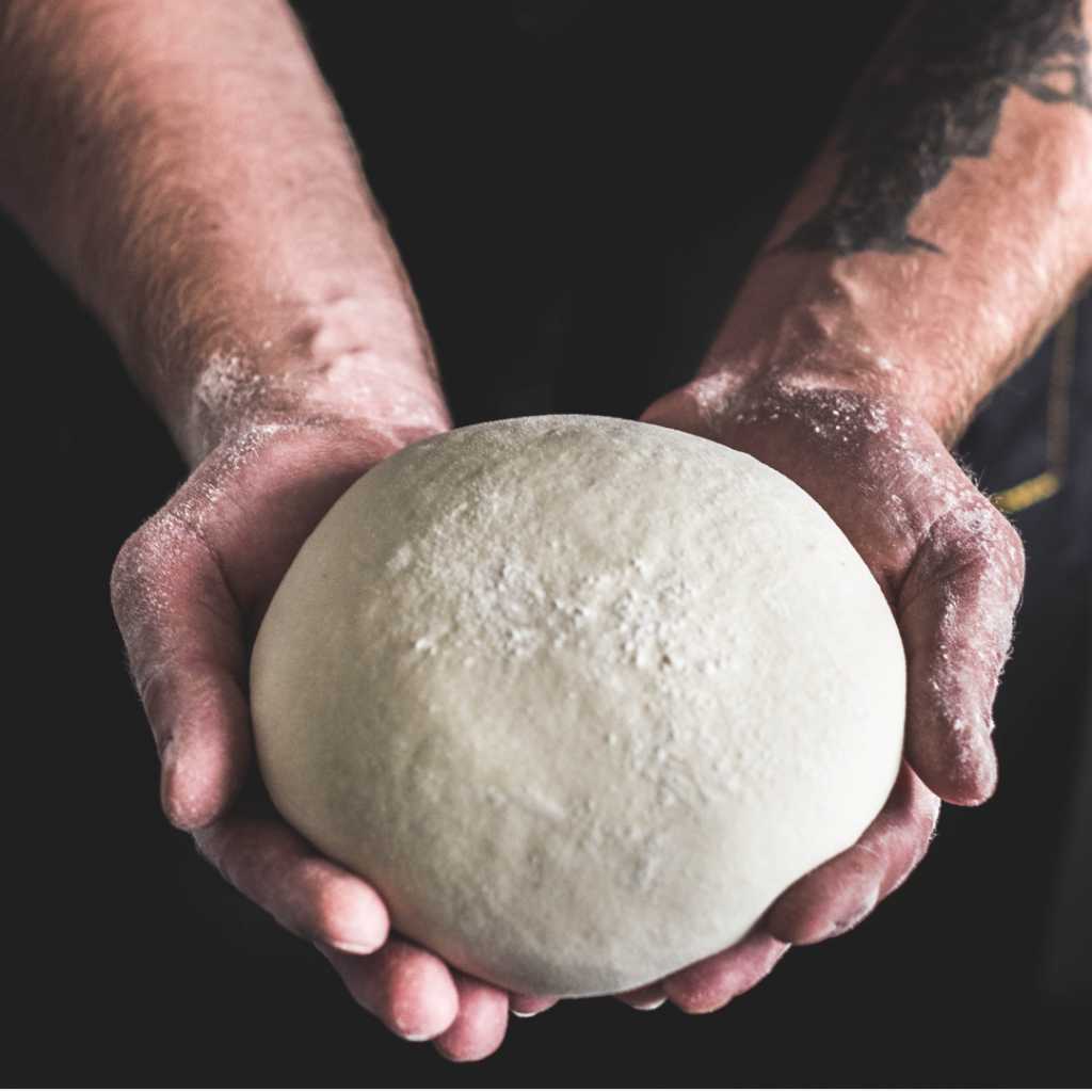 La masa de pizza la hacemos con harina, masa madre natural, sal y aceite de oliva