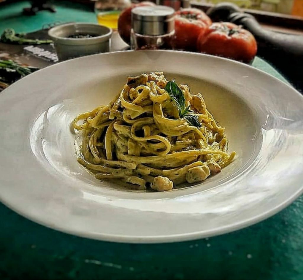Deliciosa combinacion de pollo salteado al pesto con crema de la casa y queso parmesano