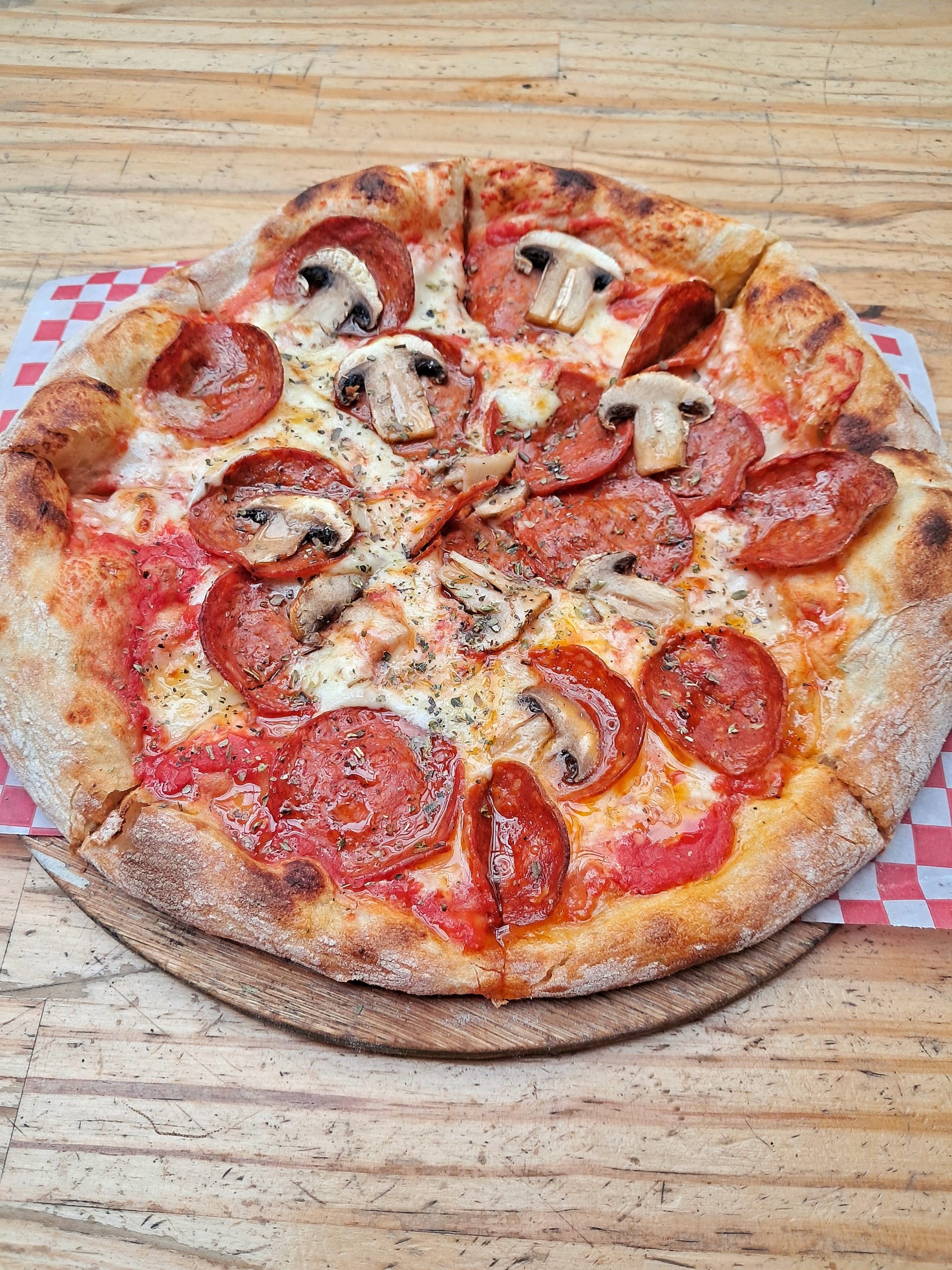 Sobre ella se funden el queso mozzarella y el intenso queso azul danes, creando una armonía cremosa con carácter. El pepperoni americano aporta ese toque crujiente y especiado, mientras que los champiñones salteados al ajo añaden profundidad y aroma.